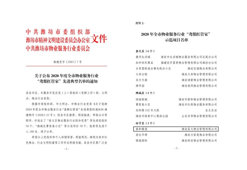 2021年1月29日,濰坊昌大物業管理有限公司負責的泰和雅筑項目,在市委組織部、市文明辦、市物業行業黨委公布的2020年度全市物業服務行業“鳶都紅管家”先進典型名單中,被評選為2020年度全市物業服務行業“鳶都紅管家”示范項目。
