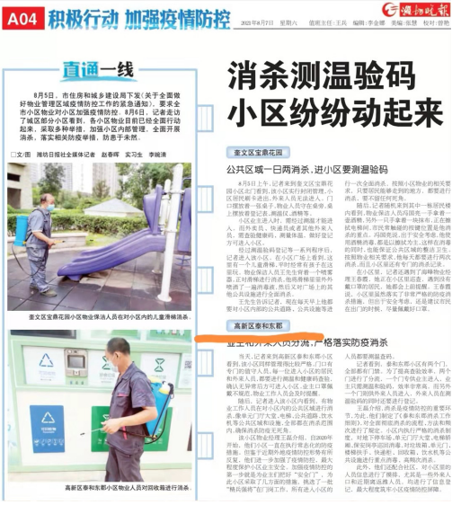 今年以來,清池街辦多次組織濰坊日報社、濰坊電視臺對泰和東郡物業項目的工作做法進行宣傳報道并在“大美清池”公眾號進行宣傳。