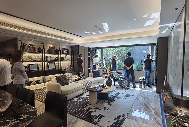在參觀南京龍湖·山與城項目時,在售樓部負責人的介紹與指引下,考察組仔細查看了樣板房內部的施工工藝與細部做法,其內部吊頂采用了目前流行的無主燈模式,使房間光線更加柔和;開關插座采用一體連排,美觀大方;廚房由于地方規范差異采用推拉窗,避免與水龍頭碰撞;窗簾采用玻璃內置百葉形式,既能實現視覺遮擋,又能滿足開窗通風的需求。地下陽光房采光井開啟扇采用頂部開啟的形式,能夠降低采光井墻體的高度,從外觀上更加美觀。售樓處中心采用大U形水吧,兩側休閑沙發,使得整個空間休閑自在,在這種環境下洽談使客戶更加放松。另跟龍湖集團成本部同仁,針對新型材料的采購渠道、價格等作了交流學習。
