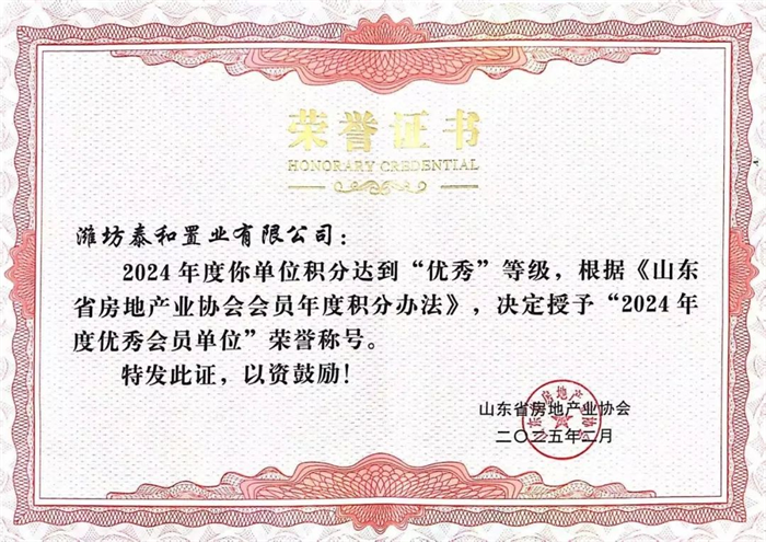 山東省房地產業協會:授予泰和置業“2024年度優秀會員單位”“兩項活動突出表現單位”