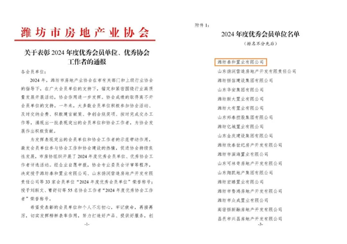 濰坊市房地產業協會:授予泰和置業“2024年度優秀會員單位”