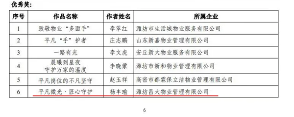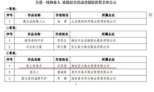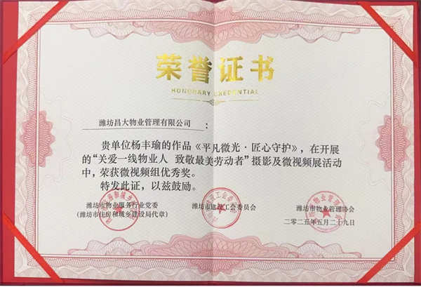 2025年5月30日,在全市物業行業“關愛一線物業人 致敬最美勞動者”攝影及微視頻展活動中,濰坊昌大物業管理有限公司提報的兩部作品雙雙獲獎!《肩上的春天》榮獲三等獎,《平凡微光·匠心守護》榮獲優秀獎,這份雙重榮譽,是對昌大物業企業文化的生動詮釋,更是對全體物業人敬業精神的崇高禮贊!