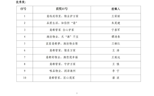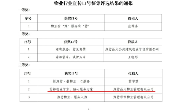 2025年7月11日,全市物業行業宣傳口號征集評選結果正式揭曉,昌大物業憑借“鳶都物業管家,貼心服務萬家”的響亮口號,從全國各地800余條投稿中脫穎而出,榮獲三等獎!這一口號充分展現了昌大物業扎根濰坊、服務萬家的責任擔當,同時展現了昌大物業“讓生活更美好”的堅定服務承諾。