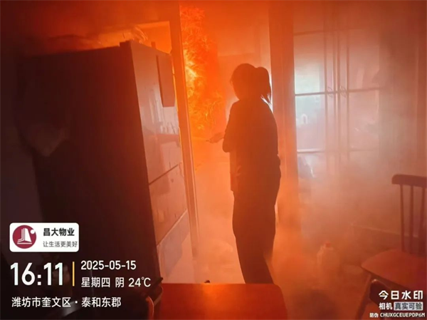 下午,西門巡查組在例行衛生清理過程中,王紹艷經理、隋麗萍、梁曉月及保潔主管毛麗梅四人突然聞到濃烈煙味,隨即聽到業主呼救聲。四人來不及做好防護,當即拎起滅火器,沿樓梯飛奔至業主家,發現廚房火勢已起,濃煙彌漫。