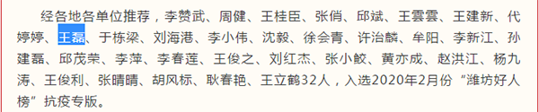新冠肺炎疫情發生以來,全市各行各業涌現出許多感人至深的“好人”事跡,為凝聚抗疫信心,由濰坊市文明辦主辦了“濰坊好人榜”抗疫好人選拔活動,昌大物業項目經理王磊在帶領團隊防疫抗疫過程中表現突出,入選了2020年2月份“濰坊好人榜”。其管轄小區在區黨工委相關領導檢查過程中,因小區在出入證管理、消殺和重點人群管理等方面的工作受到好評,其做法同時被街道物業辦在各物業項目部推廣學習,并在《濰坊晚報》《今日頭條》等新媒體上進行了宣傳報道。