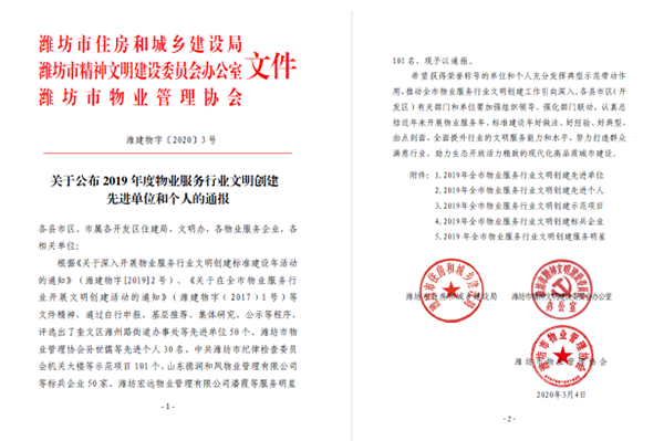近日,濰坊市住建局,市文明委辦公室,市物業(yè)管理協(xié)會聯合發(fā)文《關于公布2019年度物業(yè)服務行業(yè)文明創(chuàng)建先進單位和個人的通報》(濰建物字[2020]3號),濰坊昌大物業(yè)管理有限公司榮獲2019年度全市物業(yè)服務行業(yè)文明創(chuàng)建標兵企業(yè)榮譽稱號;王紹艷、王磊榮獲2019全市物業(yè)服務行業(yè)文明創(chuàng)建服務明星榮譽稱號。